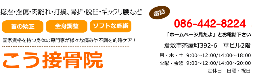 倉敷市の整骨院、腰痛、肩こり、骨盤矯正は、お任せください。こう接骨院